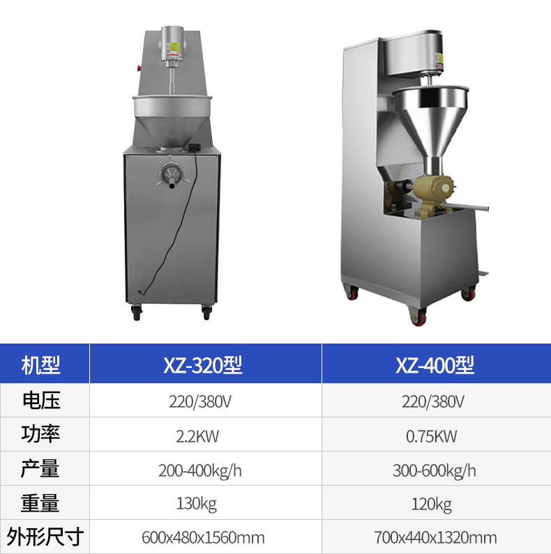 新款XZ-320不銹鋼灌腸機(jī),為XZ-200型和XZ-300型灌腸機(jī)的升級(jí)產(chǎn)品,優(yōu)勢在于絞龍出料部縮短、絞龍加大,對(duì)肉片、肉顆粒的損傷更小,肉片完整性更高,出料更快。